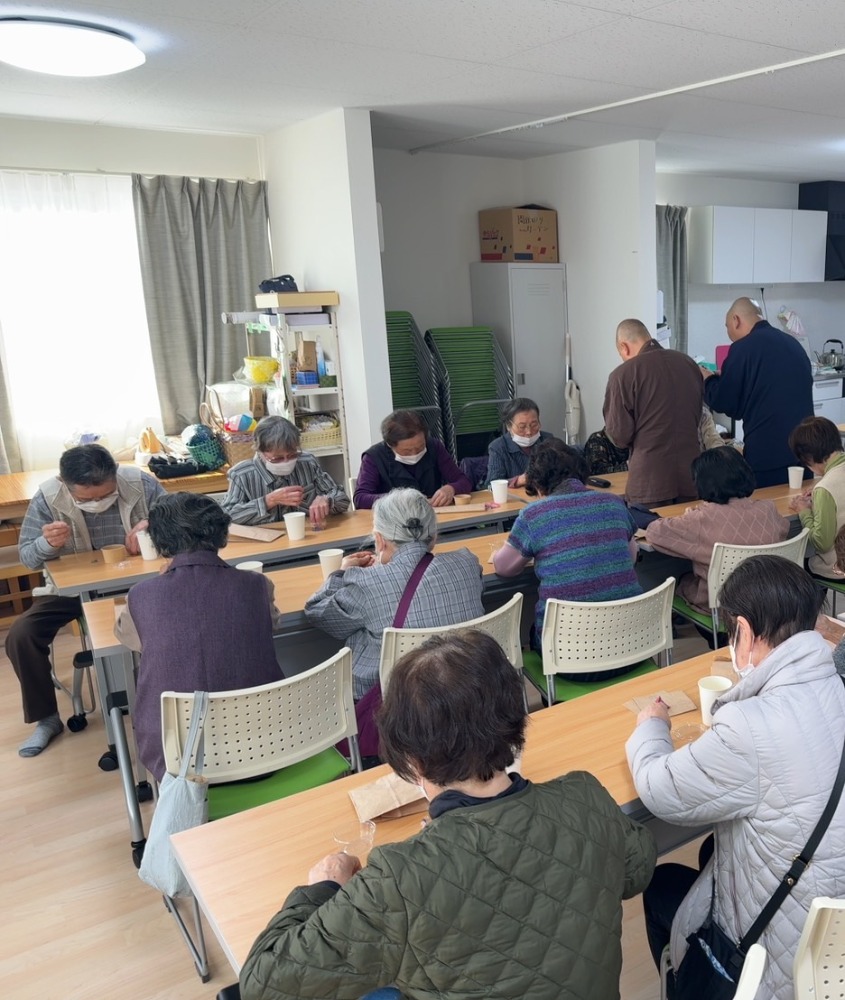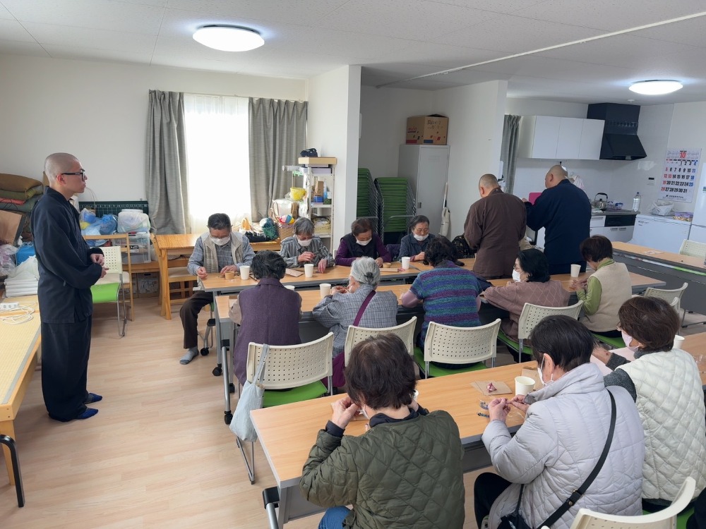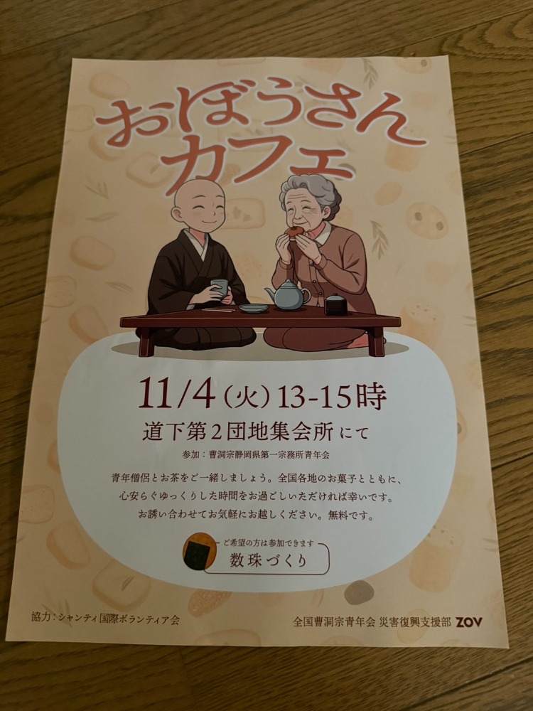 おぼうさんカフェ 活動報告(2) トップ 復興支援活動 おぼうさんカフェ 活動報告(2) 令和6年能登半島地震復興ボランティア 報告書活動日令和7年11月4日(火)天候 晴れ9:00~11:00、13:00~15:00活動場所午前の部 清水第1団地集会所 午後の部 道下第2団地集会所活動内容「おぼうさんカフェ」(傾聴活動)、一文字写経、数珠づくり参加者静岡県第一宗務所青年会会長、他 静一曹青会員2名、曹洞宗石川県青年会1名 計4名