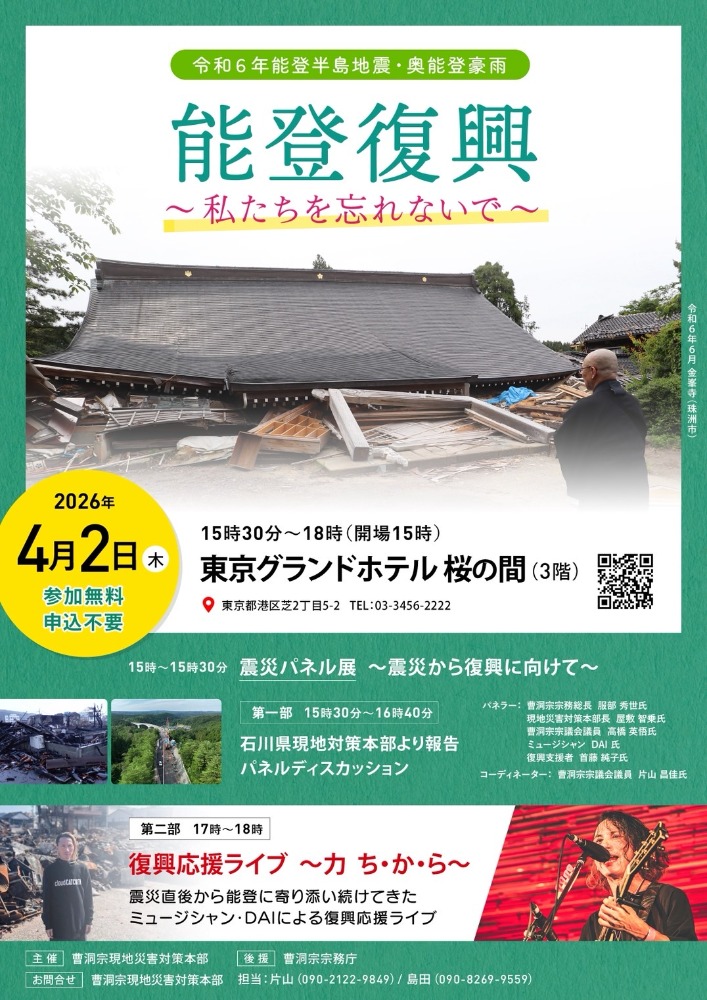 令和6年能登半島地震および奥能登豪雨からの復興支援の一環として、曹洞宗現地災害対策本部主催による震災の状況や復興への取り組みを共有するイベントを開催します。