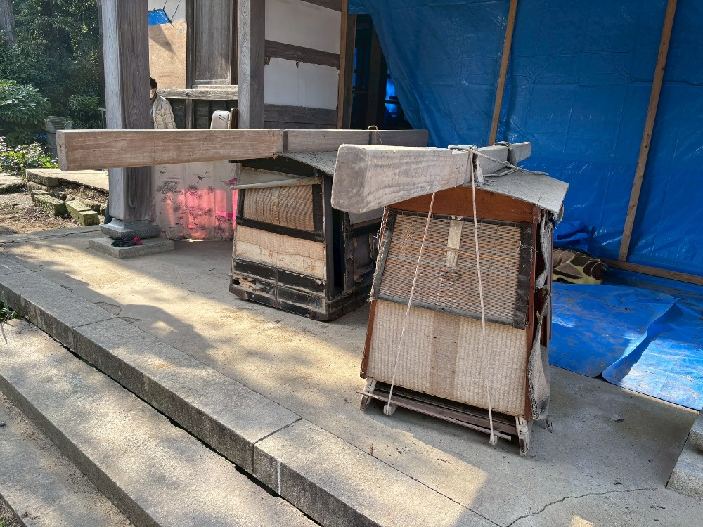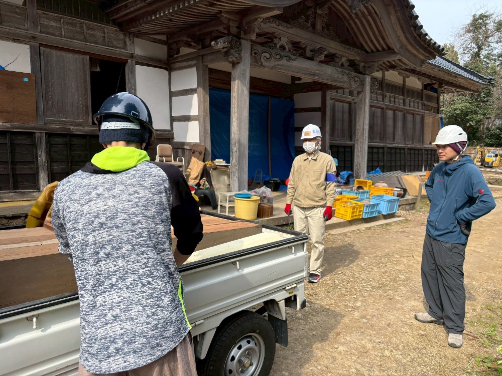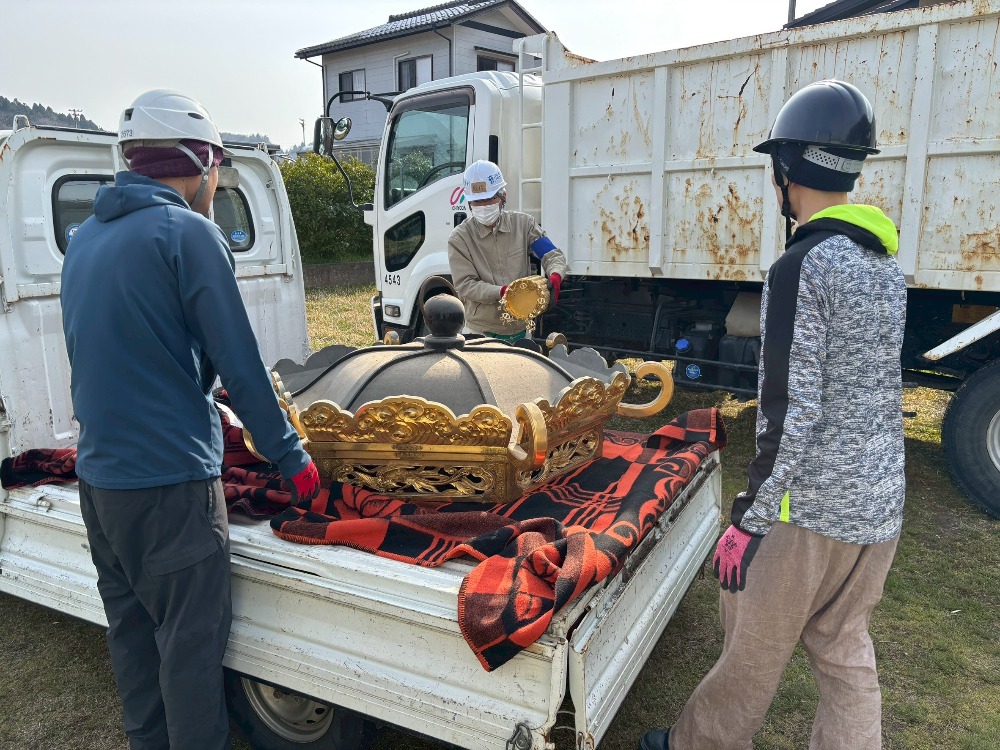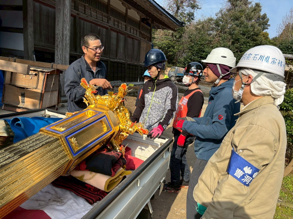 復旧作業 活動報告2(龍門寺) トップ 寺院の復旧 復旧作業 活動報告2(龍門寺) 令和6年能登半島地震「龍門寺」復興ボランティア報告書(2)活動日令和8年3月30日(月) 天候晴れ13:00~16:00活動場所龍門寺(七尾市)作業内容本堂内天蓋や仏具等の運び出し参加者石川県内寺院4名(※ボランティア団体「おらっちゃ七尾」のメンバー5名も参加) 仏具等 駕籠 幢幡 天蓋 仏具等の積み込み 人力で運び出し 関連寺院 龍門寺