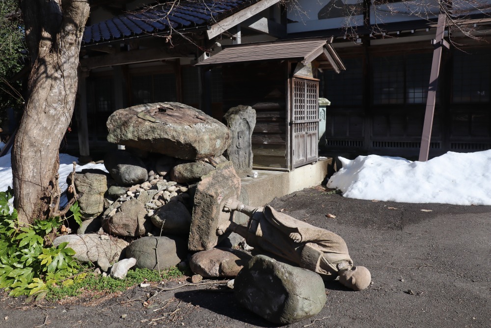 本堂前の石仏が転倒破損