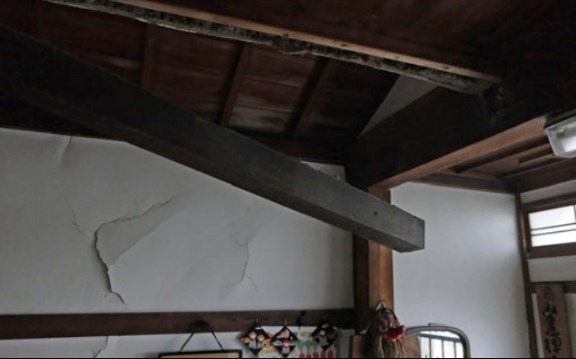 庫裡玄関/一部梁が外れかかっている、仕上壁に亀裂