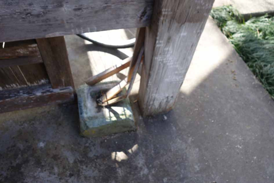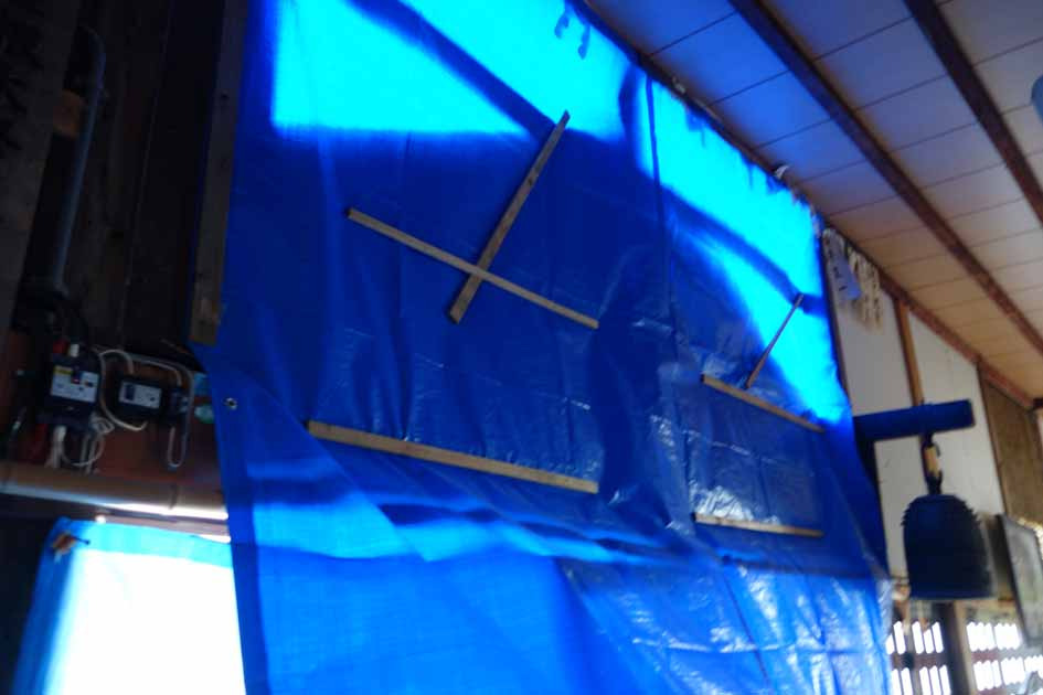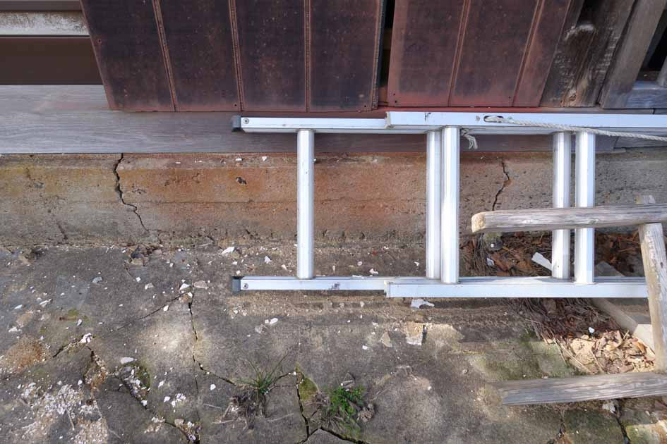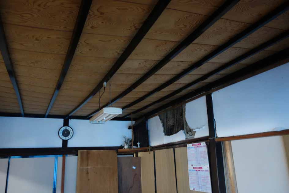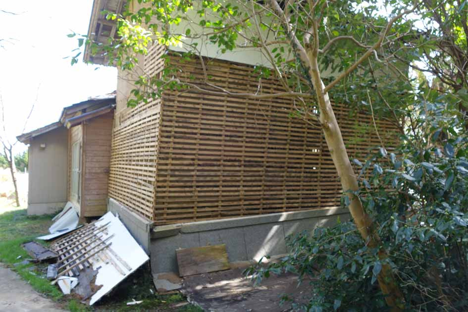 土蔵/全体的に大きく傾き、壁が広範囲に崩落している