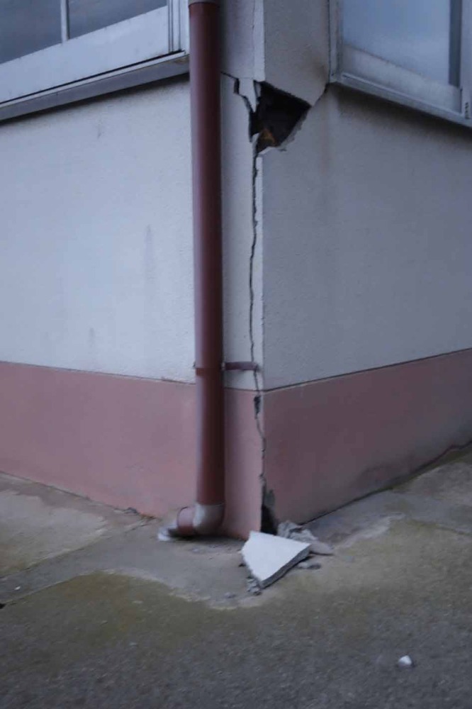 本堂/モルタル下地吹付仕上の壁が一部剝がれ