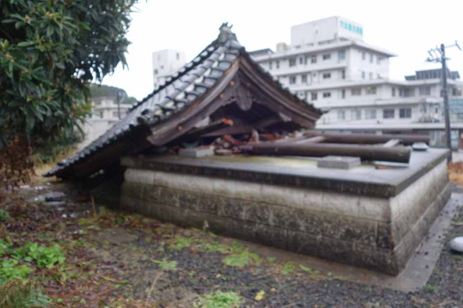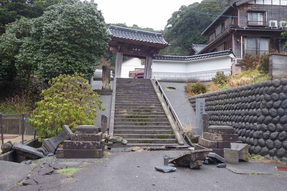 本堂/半壊、庫裏/半壊、鐘楼/全壊、山門/半壊以上、他/地面に大きな亀裂あり・石造慰霊碑や地蔵が倒壊